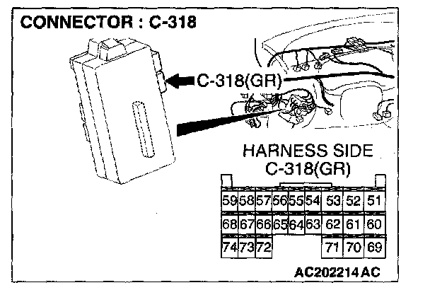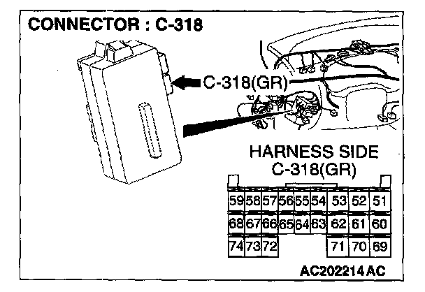 STEP 2. Check the column switch connector C-203 and ETACS-ECU connector C-318 for loose, corroded or damaged terminals, or terminals pushed back in the connector.