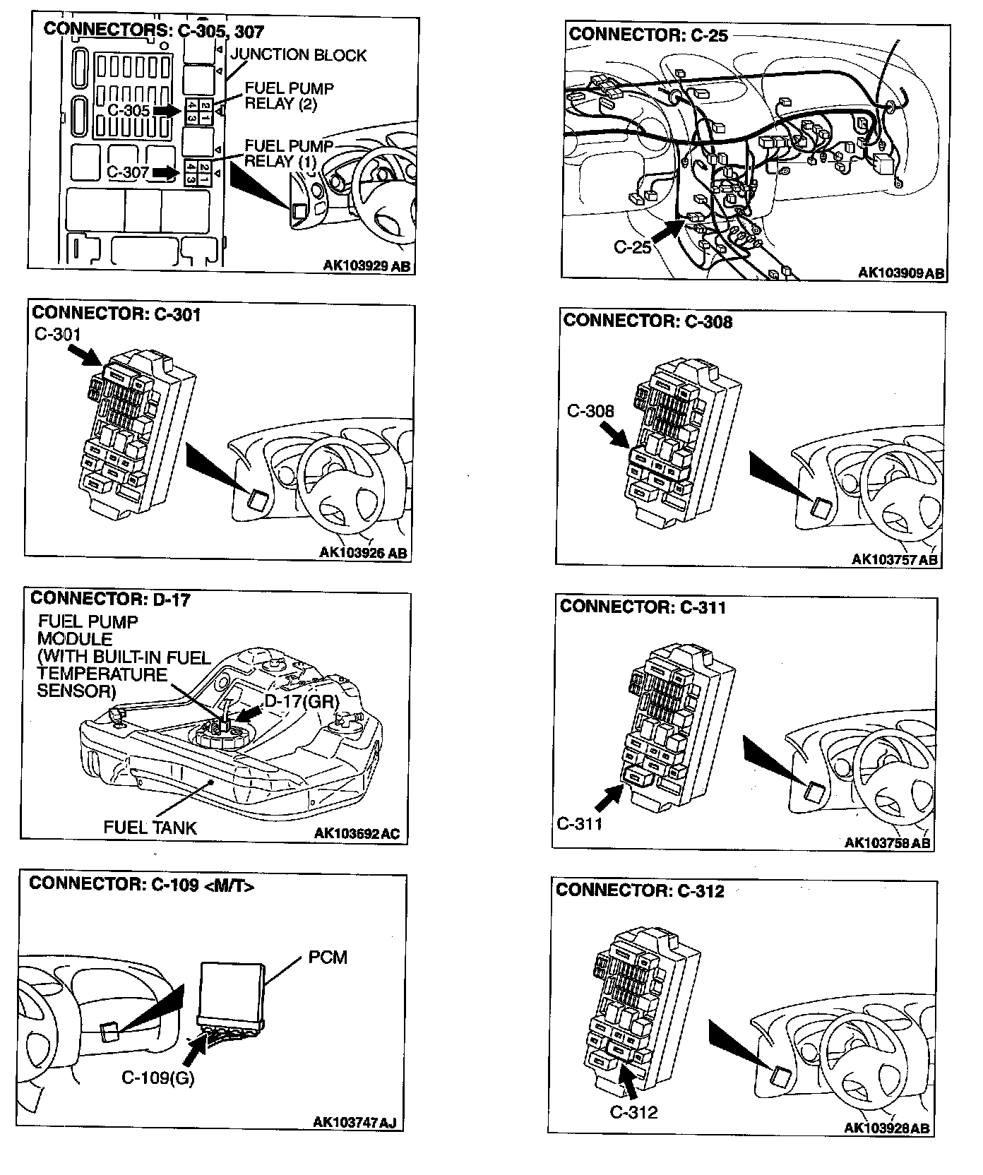 STEP 2. Check connector C-307 at fuel pump relay 1 and connector C-305 at fuel pump relay 2 for damage.