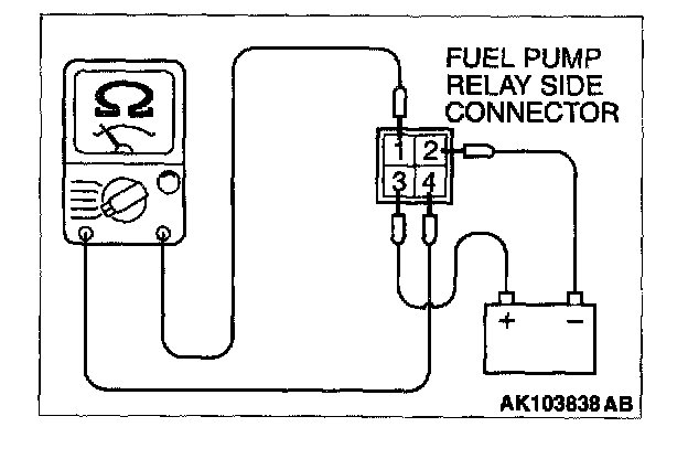 4. Check for continuity between the fuel pump relay terminals No.1 and No.4 while connecting and disconnecting the jumper wire at the negative battery terminal.