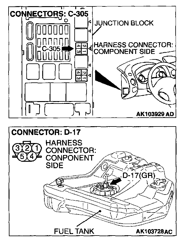 STEP 12. Check for open circuit and short circuit to ground and harness damage between fuel pump relay 2 connector C-305 (terminal No.4) and fuel pump connector D-17 (terminal No.5).