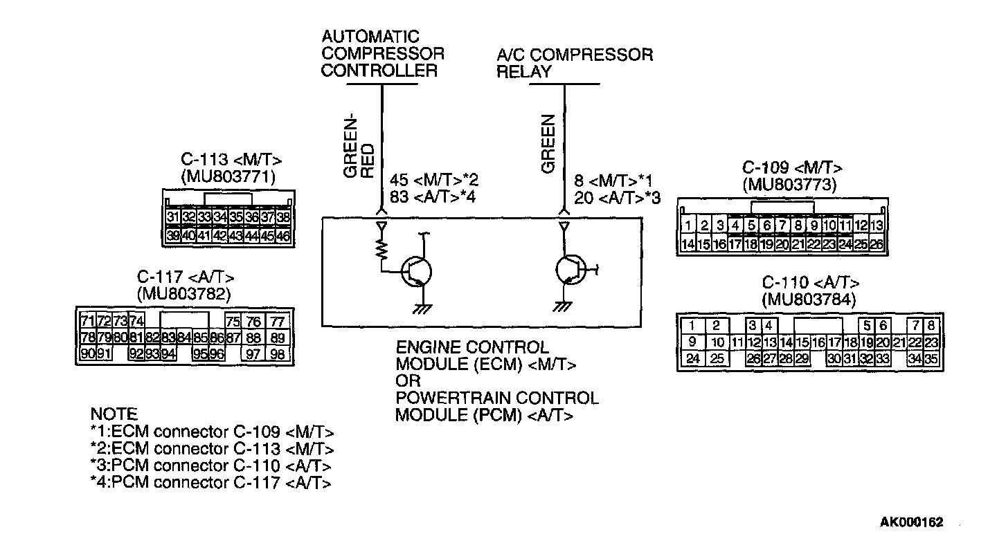 - When the A/C is "ON", the battery positive voltage is applied on the ECM (terminal No.45) PCM (terminal No.83) from the A/C belt lock-ECU.