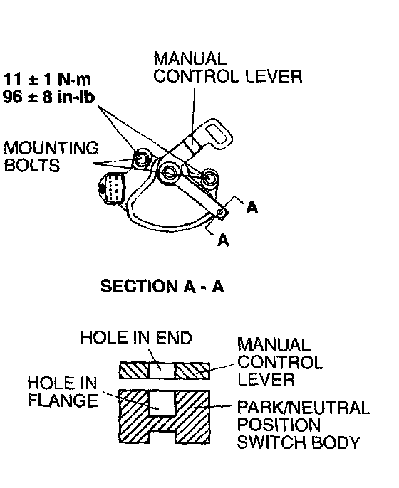 4. Loosen the park/neutral position switch body mounting bolts and turn the park/neutral position switch body so the hole in the end of the manual control lever and the hole (section A A in the figure on the left) in the flange of the park/neutral position switch body flange are aligned.