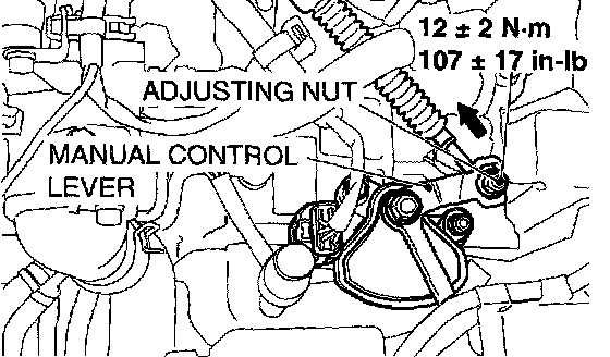 6. Gently push the transaxle control cable in the direction of the arrow, until the cable is taut. Tighten the adjusting nut.