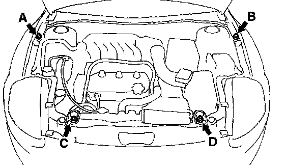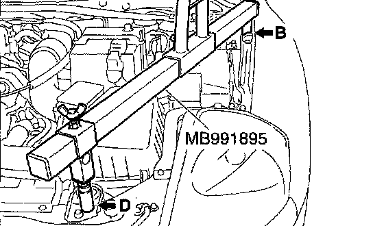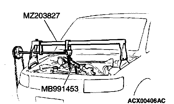 1. Set special tool MB991895 to the front fender mounting bolts (A and B) and the radiator support upper insulator mounting bolts (C and D), which are located in the engine compartment, as shown.