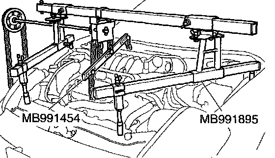 2. Set special tools MB991454 to hold the engine/transaxle assembly.