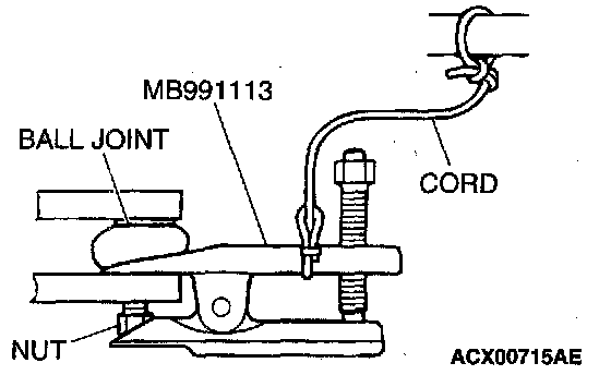 - Use special tool MB991113 to loosen the tie-rod end mounting nut. Only loosen the nut; do not remove it from the ball joint.