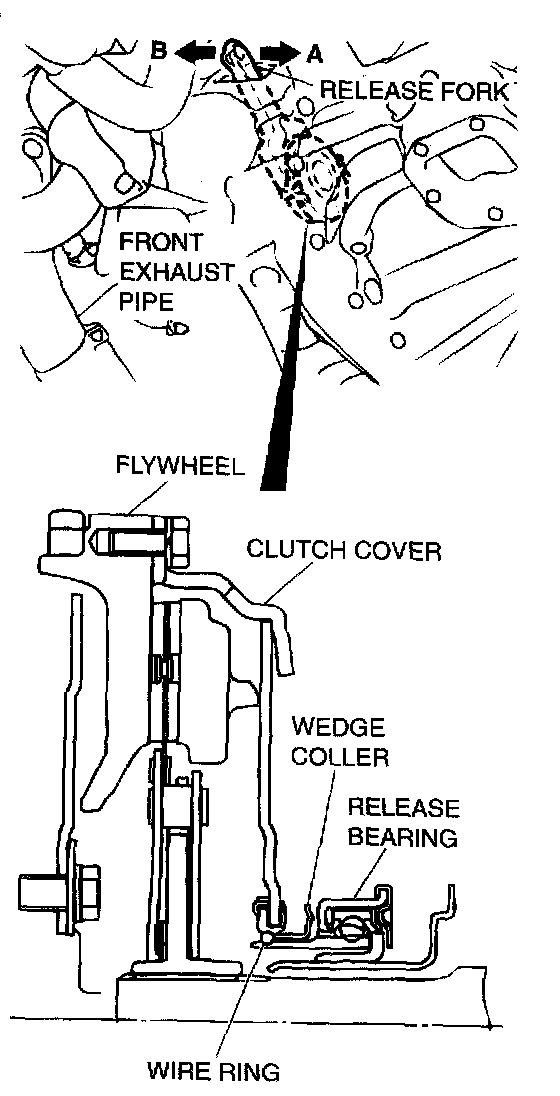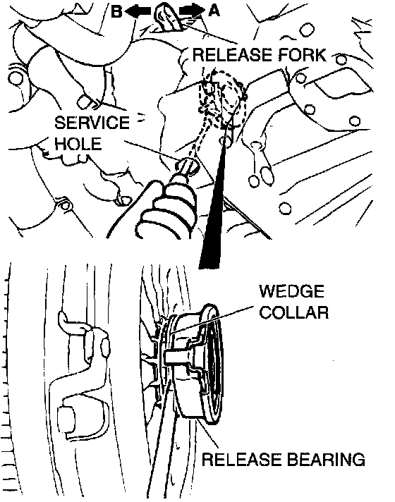 3. Disengage the wedge collar from the release bearing by using the flat-tipped screwdriver to pry gently (twisting the screwdriver handle 90 degree). NOTE: If the release bearing is disengaged, the release fork will move fully to the "B" direction via the return spring.