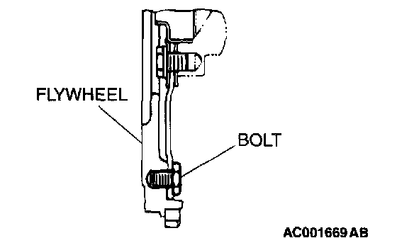 CAUTION: Do not remove the flywheel mounting bolt shown by the arrow. If this bolt is removed, the flywheel will become out of balance and damaged.