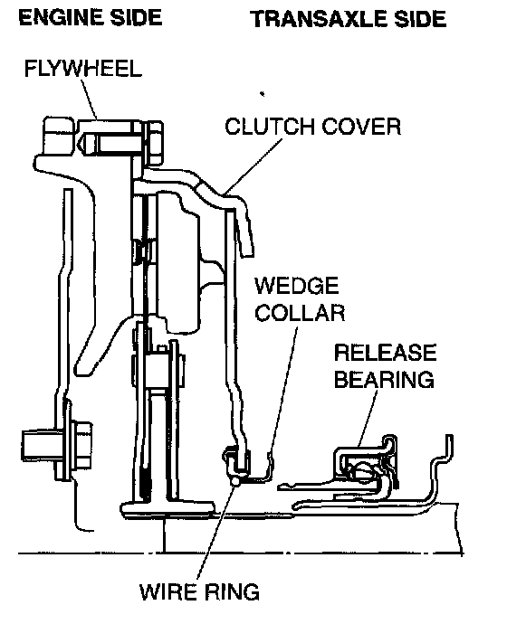 CAUTION: On the pull-type clutch, do not roll the transaxle assembly when installing it to the engine. If the transaxle assembly is rolled, the wedge collar and the wire ring will be deformed, causing a clutch malfunction due to improper engagement of the wedge collar and the wire ring.