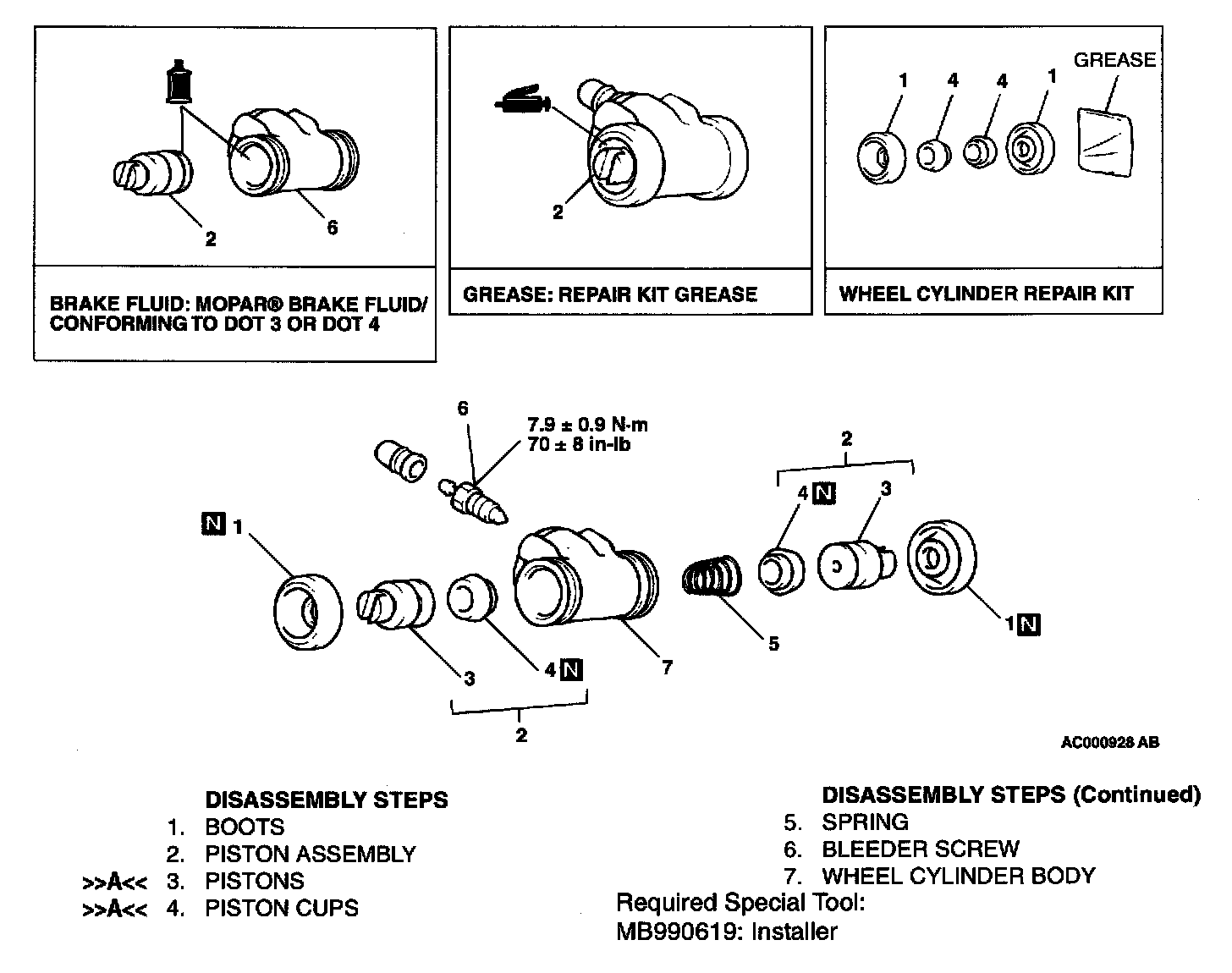 2. Apply the MOPAR Brake Fluid/Conforming to DOT 3 or DOT 4 to the piston cups and special tool MB990619.