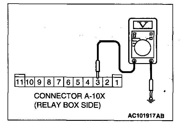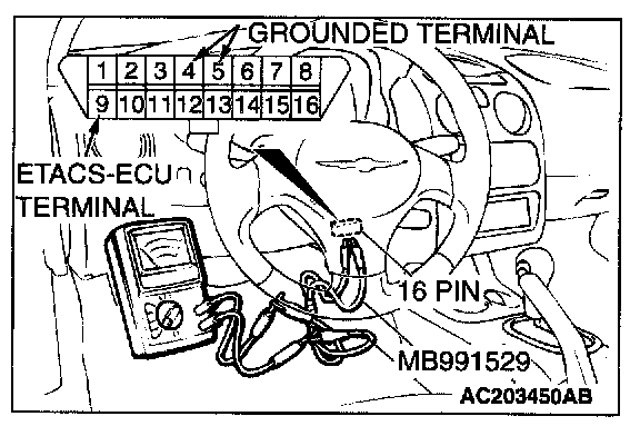 1. Use special tool MB991529 to connect a voltmeter between ground terminal 4 or 5 and ETACS-ECU terminal 9 of the data link connector.
