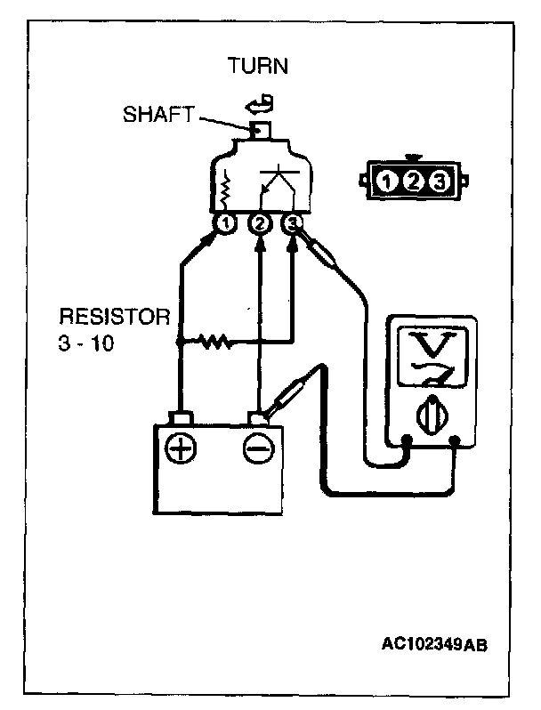 2. Turn the shaft of the vehicle speed sensor and check that there is voltage between terminals 2 - 3. (1 turn = 4 pulses)