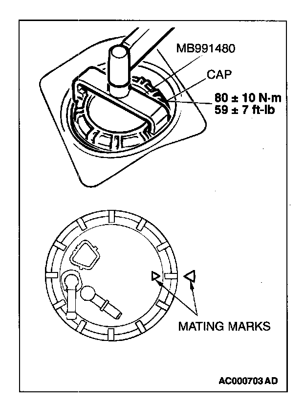 3. Use special tool MB991480 to align the mating marks on the fuel tank and fuel pump module, and tighten the cap to the specified torque.