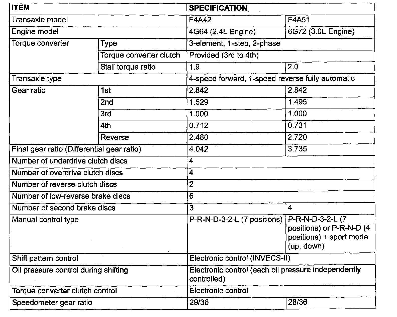 The A/T comes in two models. The F4A42 automatic transmission is paired with the 2.4L engine (4G64). The F4A51 automatic transmission is paired with the 3.0L engine (6G72).