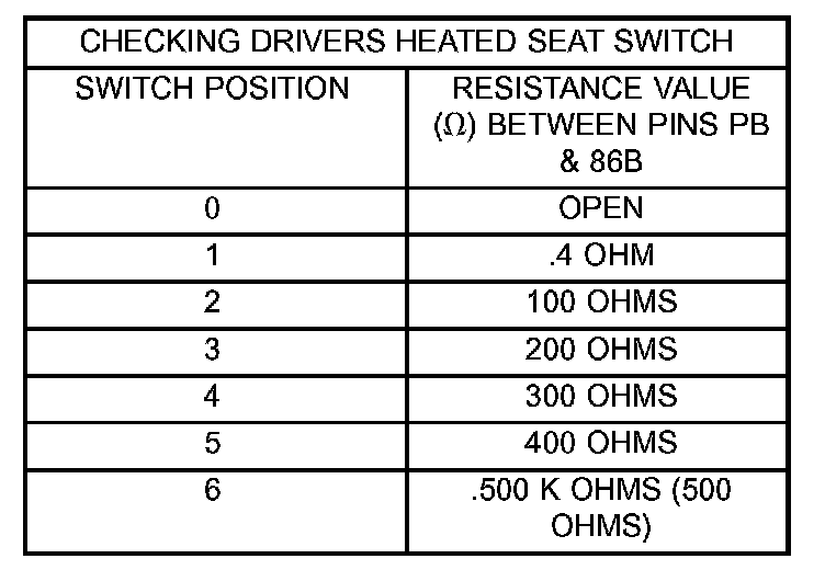 3. Check the drivers switch for resistance between pin terminals PB and 86B. Resistance should match the specifications shown in the table, as the switch is rotated from #0 - #6. If not OK, replace the heated seat switch.