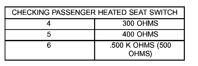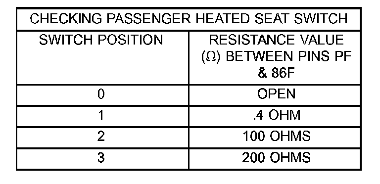 4. Check the passenger switch for resistance between pin terminals PF and 86F. Resistance should match the specifications shown in the table, as the switch is rotated from #0 - #6. If OK, test the heated seat module. If not OK, replace the heated seat switch.