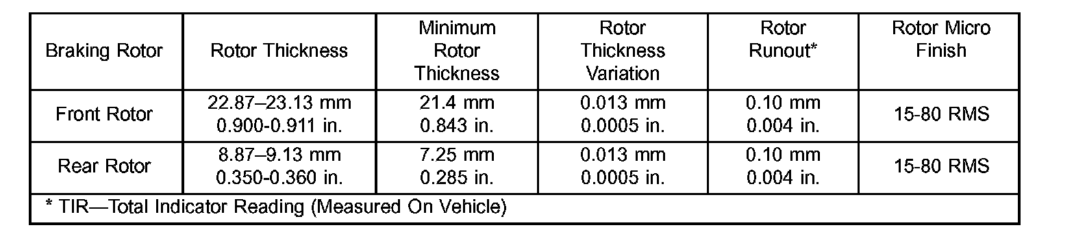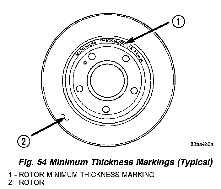 Minimum thickness specifications are cast on the rotor's unmachined surface (Fig. 54). Limits can also be found in the table at the end of this brake rotor information.