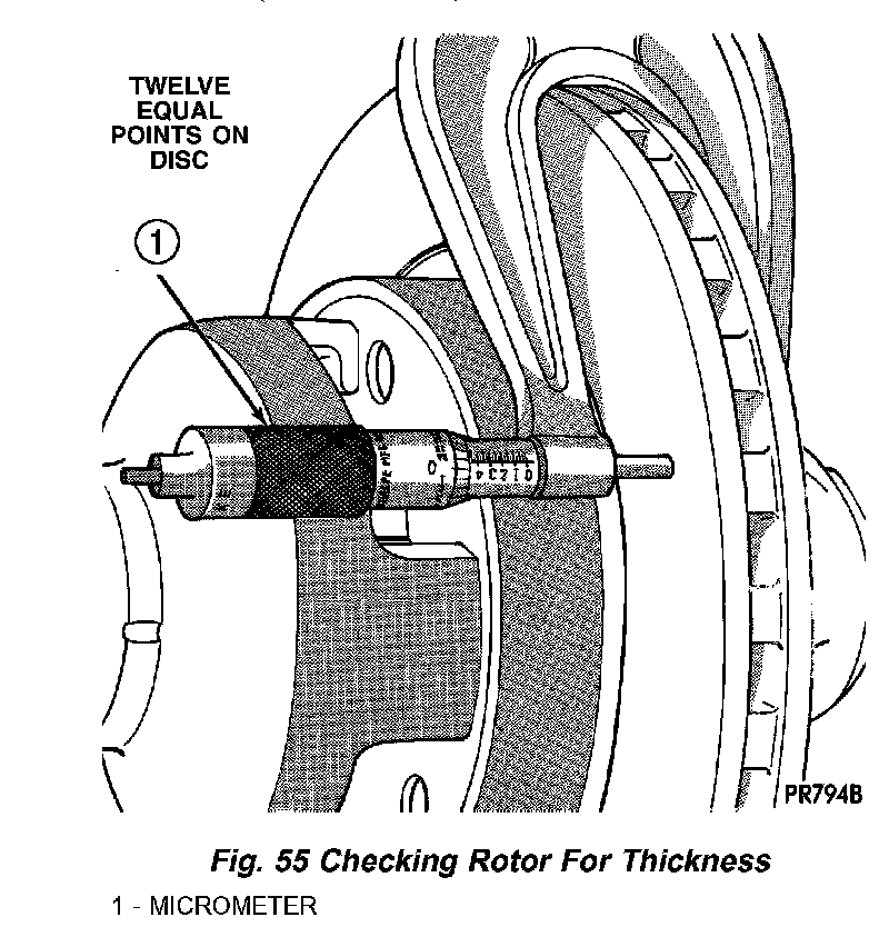 Rotor thickness variation measurements should be made in conjunction with measuring runout. Measure thickness of the brake rotor at 12 equal points around the rotor braking surface with a micrometer at a radius approximately 25 mm (1 inch) from edge of rotor (Fig. 55). If thickness measurements vary by more than 0.013 mm (0.0005 inch), the rotor should refaced or replaced.