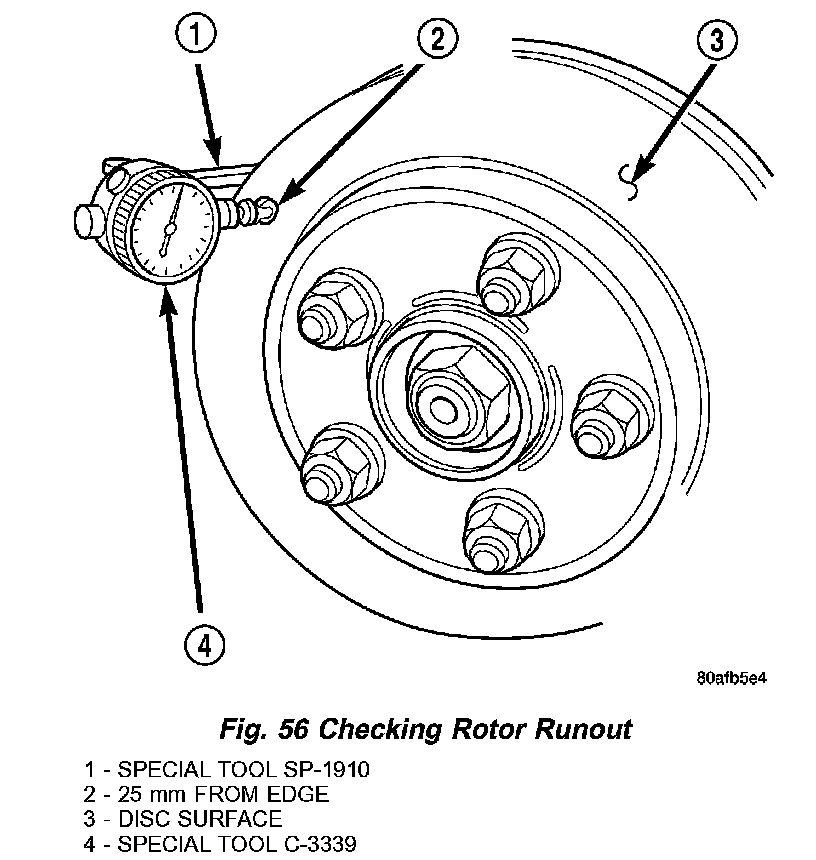 On-vehicle rotor runout is the combination of the individual runout of the hub face and the runout of the rotor. (The hub and rotor runouts are separable). To measure rotor runout on the vehicle, first remove the tire and wheel assembly. Reinstall the wheel mounting nuts on the studs, tightening the rotor to the hub. Mount the Dial Indicator, Special Tool C-3339, with Mounting Adaptor, Special Tool SP1910 on steering arm. The dial indicator plunger should contact braking surface of rotor approximately 25 mm (one inch) from outer edge of rotor (Fig. 56). Check lateral runout on both sides of the rotor, marking the low and high spots on both. Runout limits can be found in the table at the end of this brake rotor information.