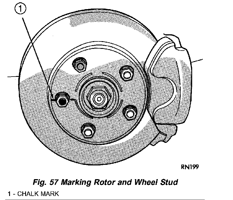 If runout is in excess of the specification, check the lateral runout of the hub face. Before removing the rotor from the hub, place a chalk mark across both the rotor and the one wheel stud closest to where the high runout measurement was taken. This way, the original mounting spot of the rotor on the hub is indexed (Fig. 57).Remove the rotor from the hub.