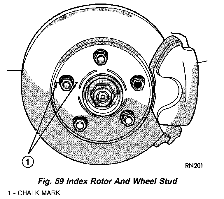 If the hub runout does not exceed this specification, install the rotor back on the hub, aligning the chalk marks on the rotor with a wheel mounting stud, two studs apart from the original stud (Fig. 59). Tighten nuts in the proper sequence and torque to specifications.