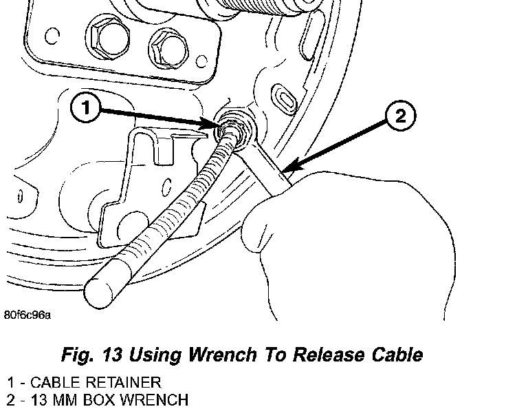 8. Disengage and remove parking brake cable from support plate. This can be easily accomplished by placing a 13 mm box wrench over cable housing retainer, compressing retainer fingers, then pulling cable out rear of support plate.