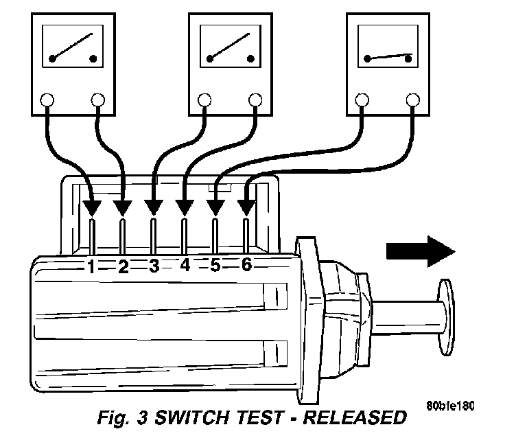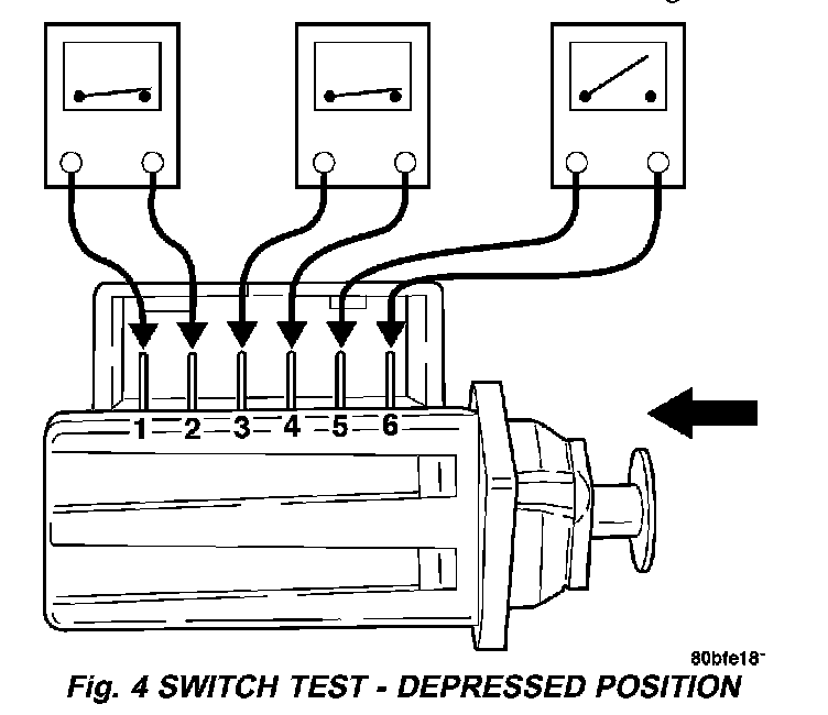 4. With the switch in the depressed position (plunger pushed in), use an ohmmeter to test each of the three internal switches as shown. You should achieve the results as listed.