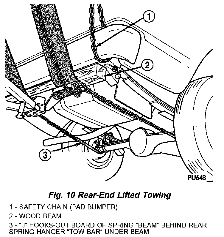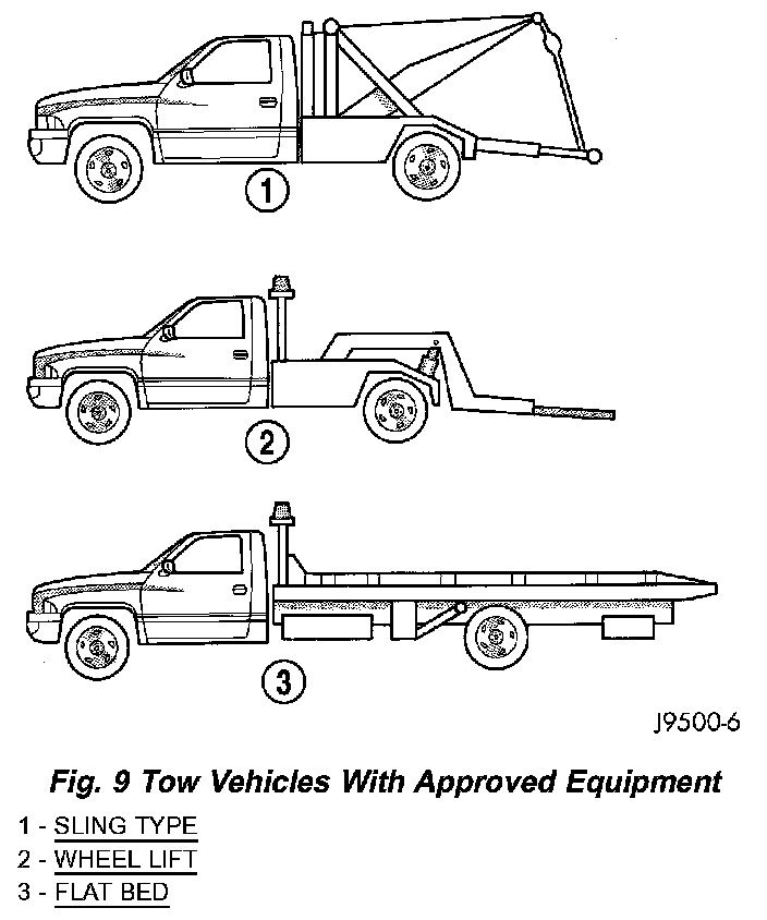 A vehicle equipped with SAE approved sling-type towing equipment, a wheel-lift towing device or a vehicle with a flat-bed device can be used to transport all RAM VAN or WAGON vehicles (Fig. 9).