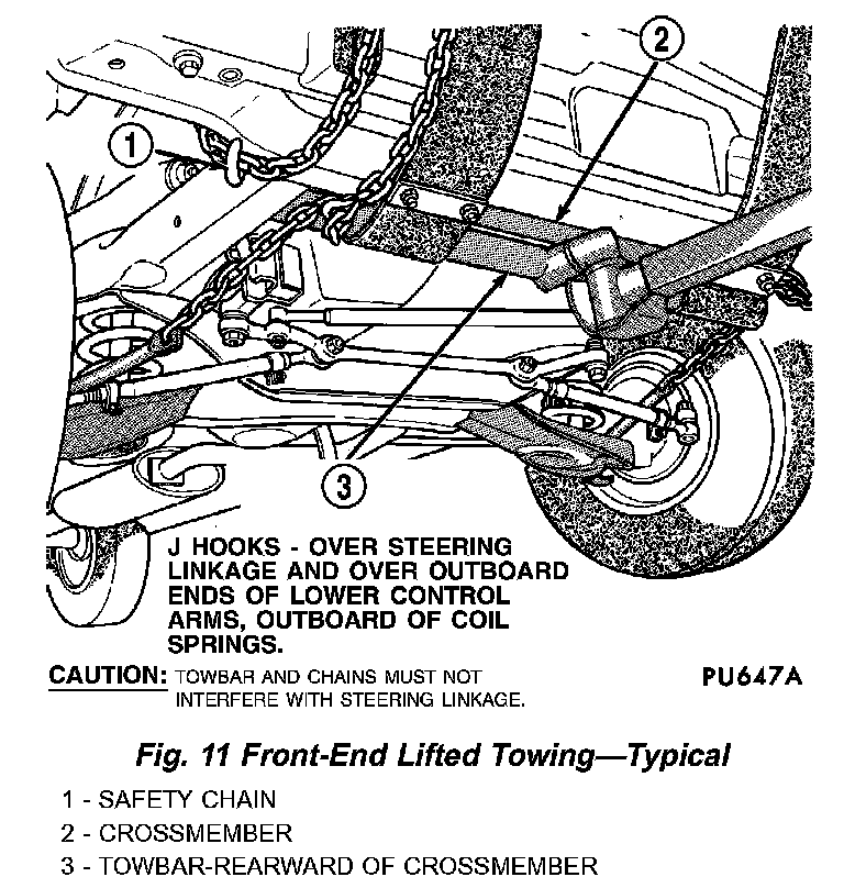 CAUTION: Use tow chains with J-hooks for connecting to the disabled vehicle's lower suspension arms. Never use T-hooks.