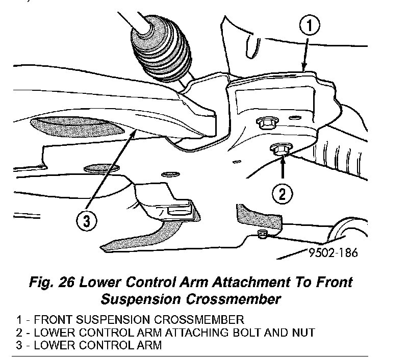 11. Remove nut and bolt attaching rear of lower control arm to front suspension crossmember (Fig. 26).