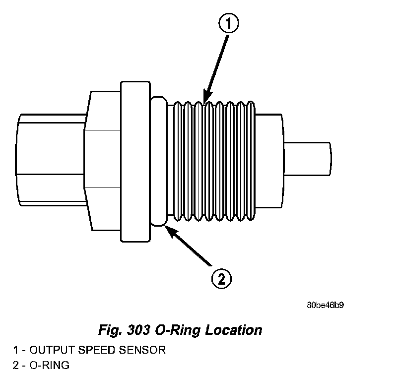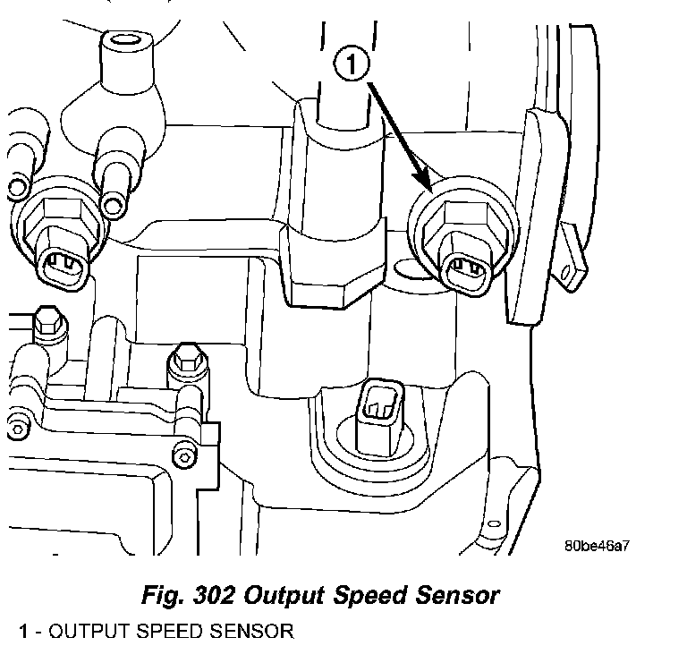 DESCRIPTIONThe Output Speed Sensor is a two-wire magnetic pickup device that generates an AC signal as rotation occurs. It is threaded into the transaxle case (Fig. 302), sealed with an O-ring (Fig. 303), and is considered a primary input to the Transmission Control Module (TCM).