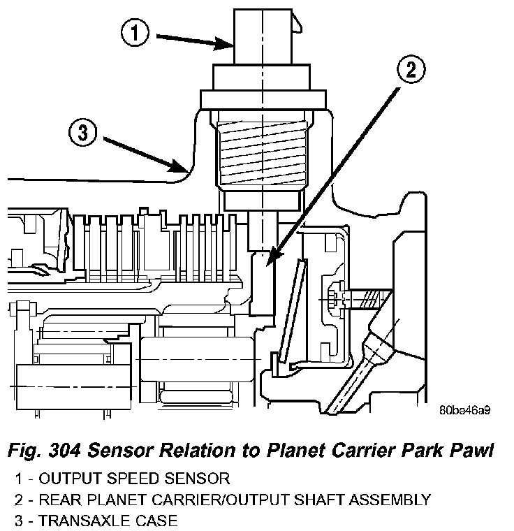 The Output Speed Sensor provides information on how fast the output shaft is rotating. As the rear planetary carrier park pawl lugs pass by the sensor coil (Fig. 304), an AC voltage is generated and sent to the TCM. The TCM interprets this information as output shaft rpm.