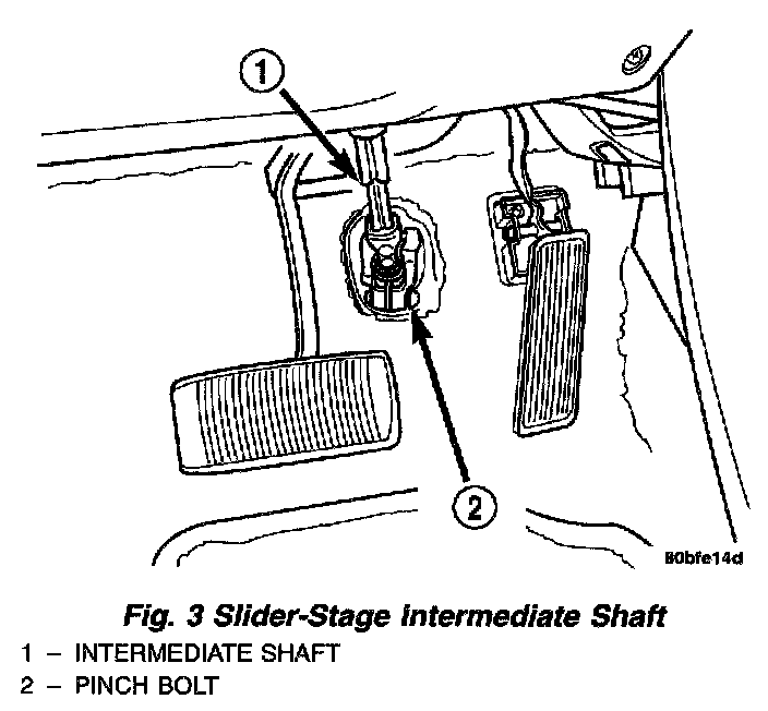 25. Under the instrument panel, disconnect the intermediate shaft from the steering gear shaft. To do so, remove the pinch bolt from the intermediate shaft coupler, then slide the intermediate shaft up and off the steering gear shaft.