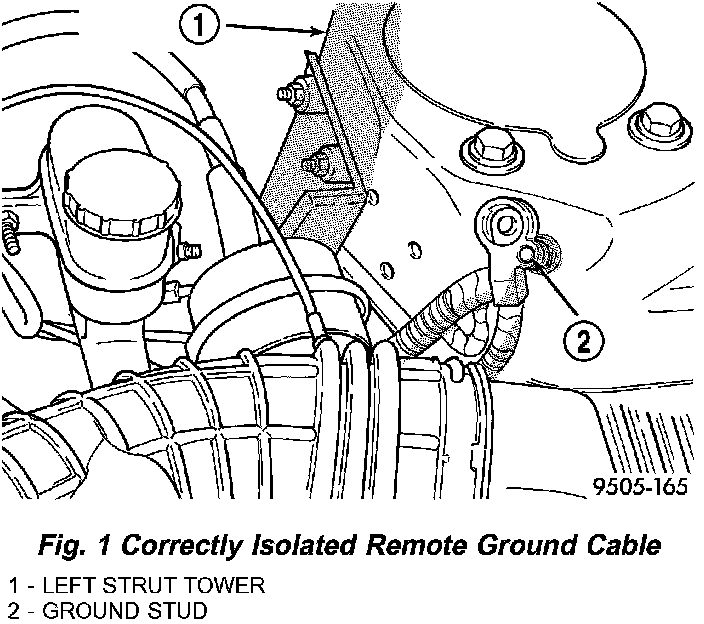 1. Open hood and remove remote ground cable from ground stud on left front shock tower. Isolate ground cable from vehicle by installing cable isolator on ground stud.