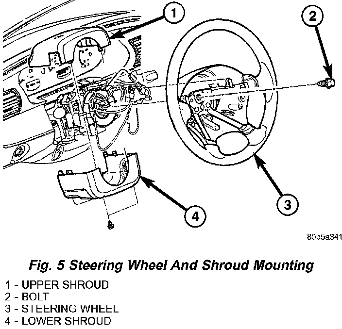 19. Remove 2 screws attaching upper and lower shrouds to steering column. First remove upper shroud from steering column by pressing inward on upper shroud just above the parting line while pulling upper and lower shrouds apart. Next, release tilt lever and tilt steering column to its highest point. Then remove lower shroud from steering column.