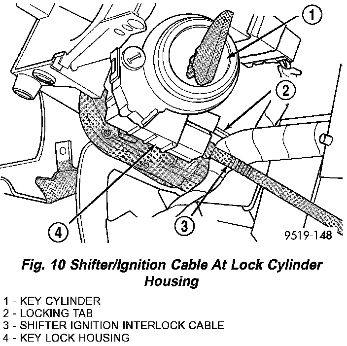 24. If vehicle is equipped with an automatic transaxle, rotate the key cylinder to the ON position. Depress locking tab on shifter/ignition interlock cable and remove the cable from the key lock housing.