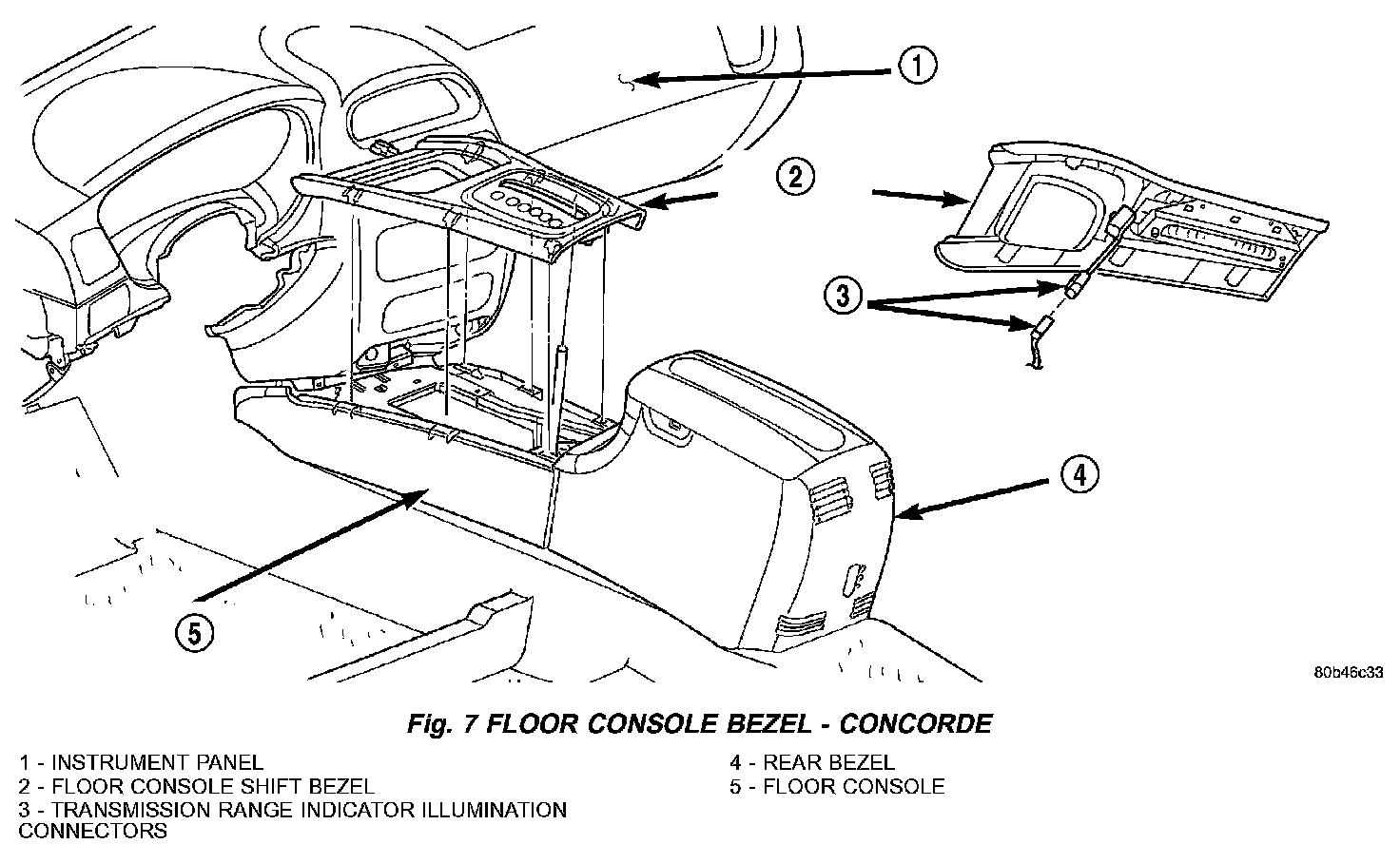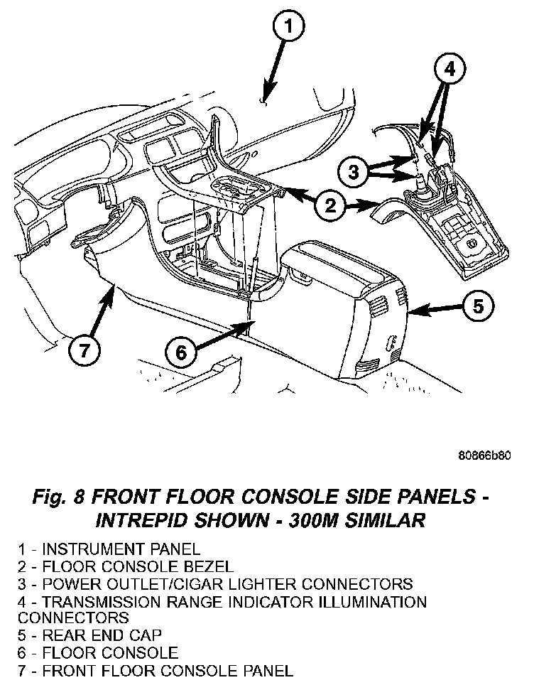 5. Disengage clips attaching bezel to floor console (Fig. 7), or (Fig. 8).