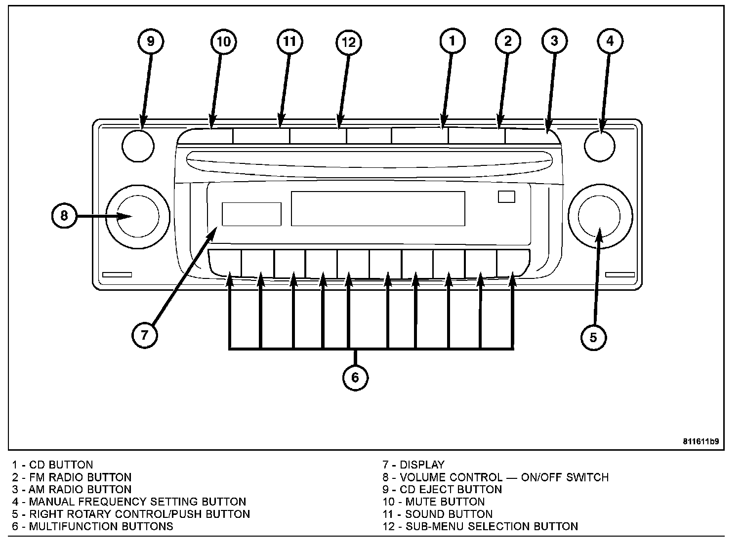 The audio system is standard factory-installed equipment. The system uses an ignition switched source of battery current so that the system will only operate when the ignition switch is in the ON/RUN or START positions.
