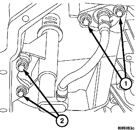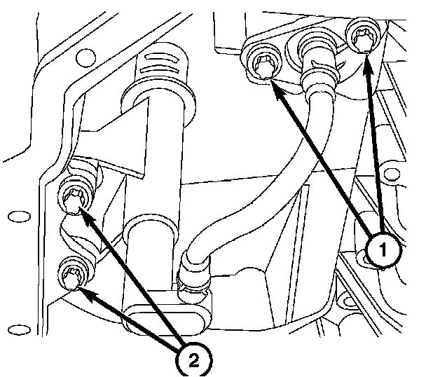 4. Remove the two harness retainer screws (2) and the oil level/temperature sensor.