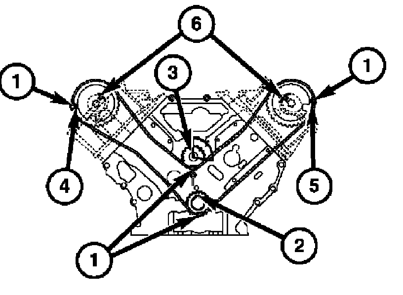 2. Remove the timing chain guides (1) off of the mounting pins. Inspect and replace worn or damaged guides as required.