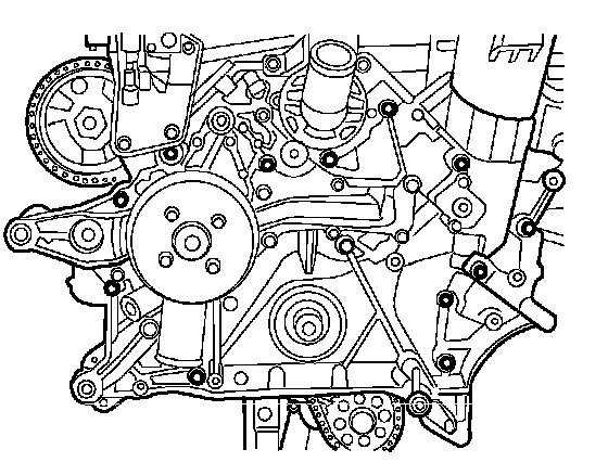 5. Install the timing chain cover bolts and tighten to 20 Nm (15 ft. lbs.).