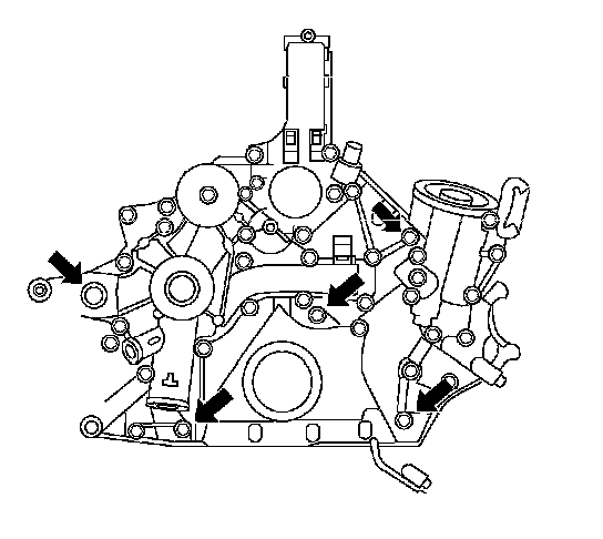 Note: Ensure that the bolts indicated by the arrows are installed with thread sealer prior to assembly.