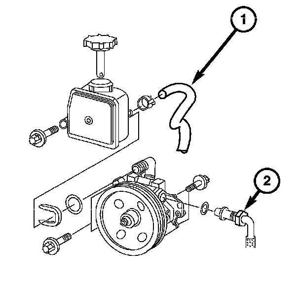 13. Install the power steering pump, return hose (1), and pressure hose (2).