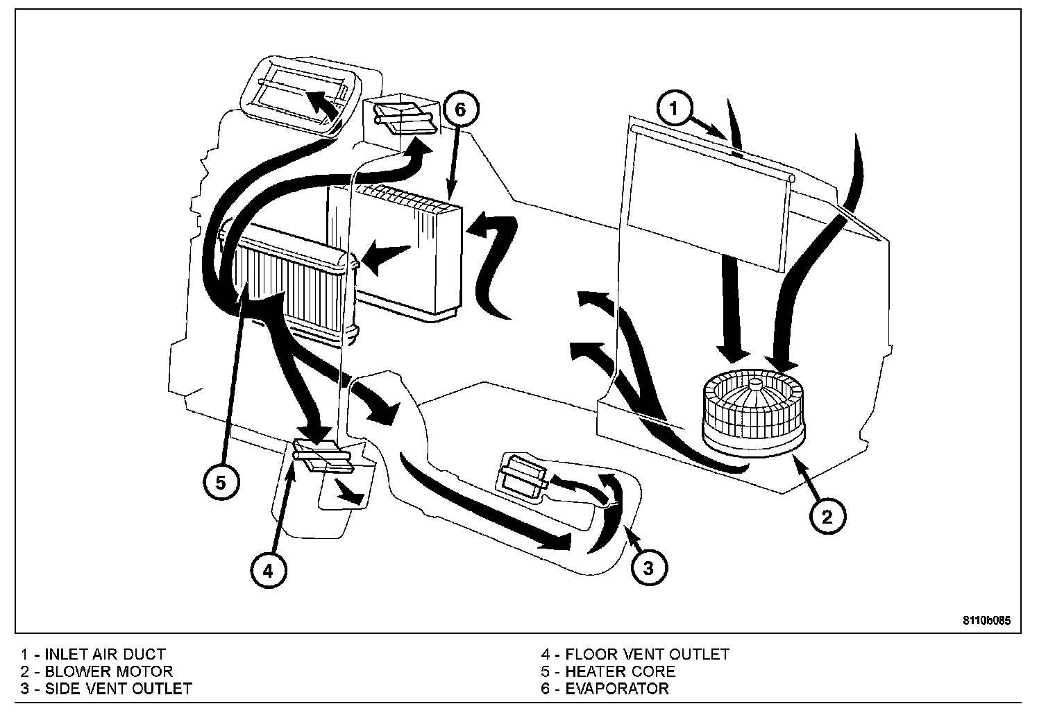 The air conditioning system is designed to provide the passenger compartment with low temperature and low humidity air. The evaporator (6), located in the HVAC housing behind the instrument panel, is cooled to temperatures near the freezing point. As warm damp air passes through the cooled evaporator (6), the air transfers its heat to the refrigerant in the evaporator (6) and the moisture in the air condenses on the evaporator fins.