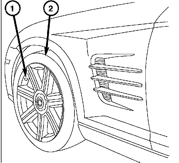 The tire pressure monitoring system utilizes transmitters that are located in the valve stem (1) of each tire (2) to communicate the tire pressure condition to the module. If a tire has low air pressure, an indicator light on the instrument cluster is illuminated. The vehicle operator must check the tire pressure of each tire in order to determine which tire has a low pressure condition.