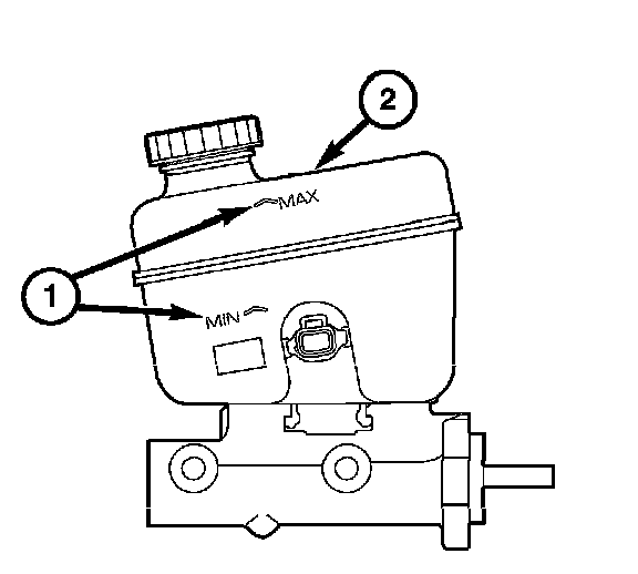The reservoir (2) has a "MIN" and a "MAX" mark (1) on the side. Always fill to the "MAX" mark.