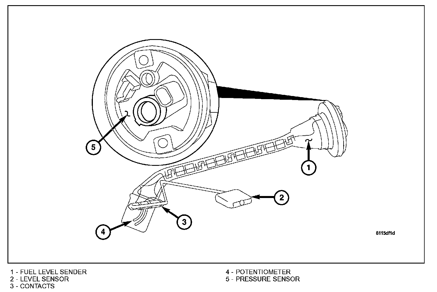 FUEL LEVEL SENDING UNITThe fuel level sending unit (1) contains a variable resistor (3) (track). As the float (2) moves up or down, electrical resistance will change. Refer to Instrument Panel and Gauges for Fuel Gauge testing. To test the gauge sending unit only, it must be removed from vehicle. The sending unit is a part of the fuel level sending unit/sensor, located and accessible at the top of the fuel tank. Measure the resistance across the sending unit terminals. With float (2) in up position, resistance should be 20 ohms (+/-5%). With float (2) in down position, resistance should be 270 ohms (+/-5%).