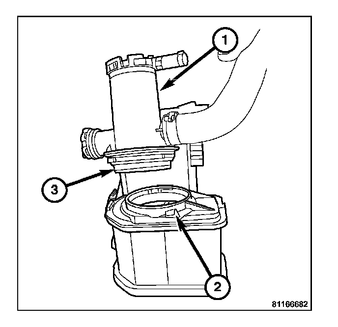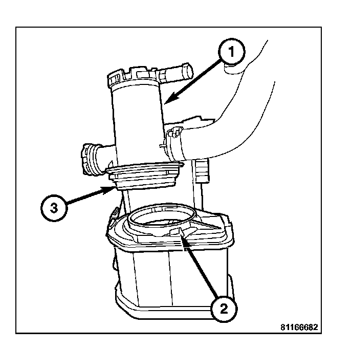 1. Install the charcoal canister shutoff valve (1) to EVAP canister (2) using new 0-ring (3).
