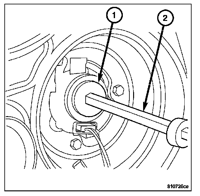 6. If the removed clockspring is to be reused, be certain to secure the clockspring rotor to the clockspring case to maintain clockspring centering until it is reinstalled on the steering column. If clockspring centering is not maintained, the clockspring must be centered again before it is reinstalled.