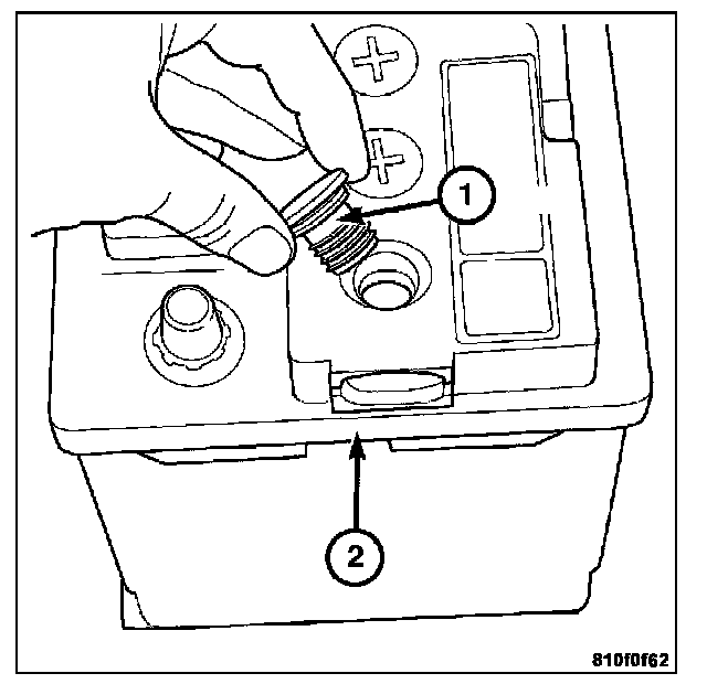 2. Look through the battery cap holes (1) to determine the level of the electrolyte in the battery. The electrolyte should be approximately 1 centimeter above the battery plates or until the lip (2) inside the battery cap holes is covered.